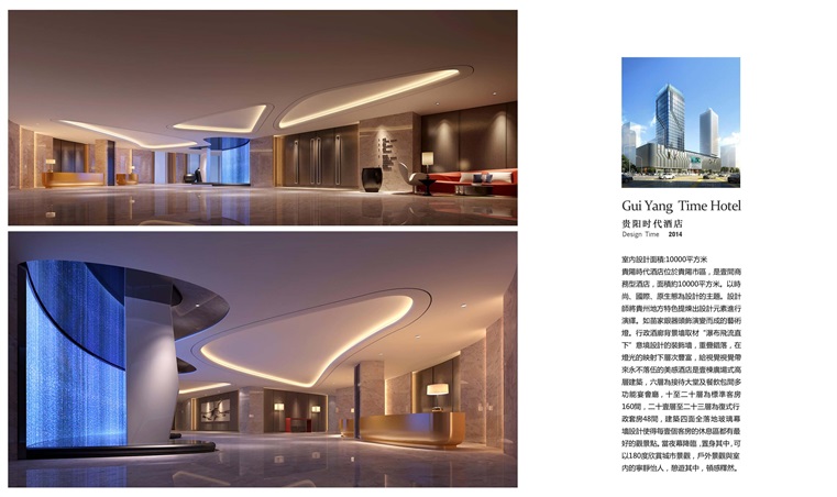 貴陽時代酒店位於貴陽市區,是一間商務型酒店,面積約10000平方米。以時尚、國際、原生態為設計的主題。