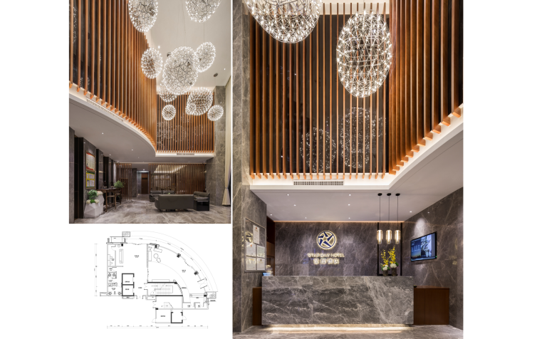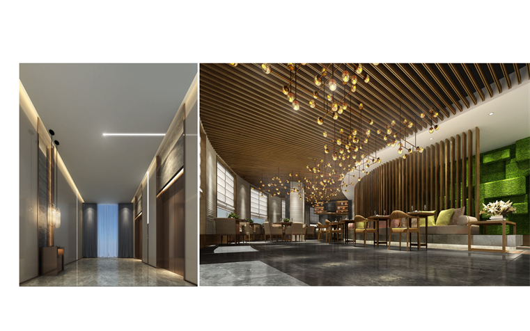 大堂空間以建築設計手法延伸貫穿進室內空間,簡潔卻不失高端,舒適又不失奢華。商務與休閒並舉,與商務大堂往來分赴卻不互相幹擾,入門處增加的挑高令客人感受到高曠感延伸空間視覺。