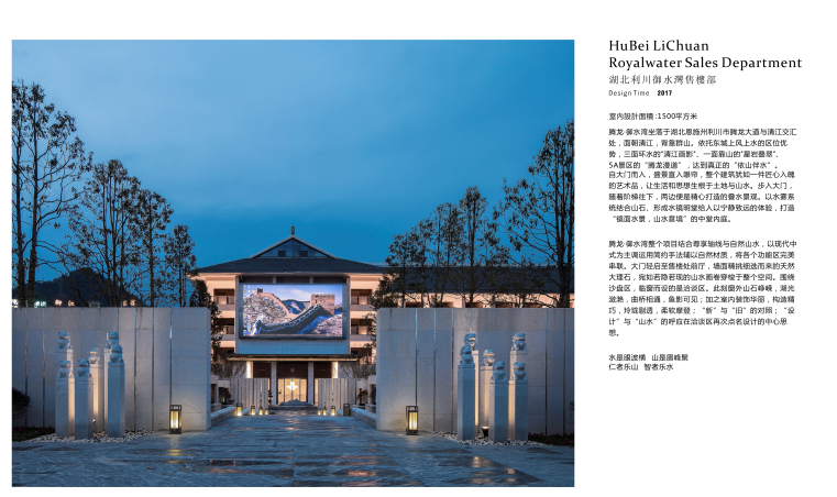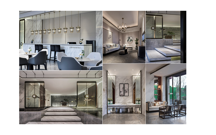 腾龙·御水湾整个项目结合尊享轴线与自然山水,以现代中式为主调运用简约手法辅以自然材质,将各个功能区完美串联。大门轻启至售楼处前厅,墙面精挑细选而来的天然大理石,宛如若隐若现的山水画卷穿梭于整个空间。围绕沙盘区,临窗而设的是洽谈区。此刻窗外山石峥嵘,湖光潋滟,曲桥相通,鱼影可见;加之室内装饰华丽,构造精巧,玲珑剔透,柔软摩登;“新”与“旧”的对照;“设计”与“山水”的呼应在洽谈区再次点名设计的中心思想。